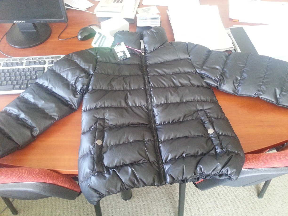 A kabátban lévő méret S-es, de inkább M-L-es méretnek felel meg! Jó téli kabátnak is, könnyű, víz lepergetős!